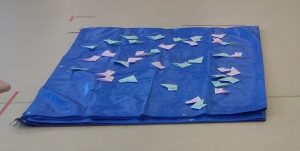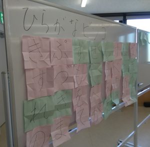 ビンゴゲームは、ひらがなを使ったもので、ひらがなのカードをつくって池に見立てたシートの上に置き、これを釣り竿で釣ります。参加者たちはひらがなのビンゴカードを持っており、一文字吊り上げられるごとに該当する文字が記されたマス目をくりぬいていきます。